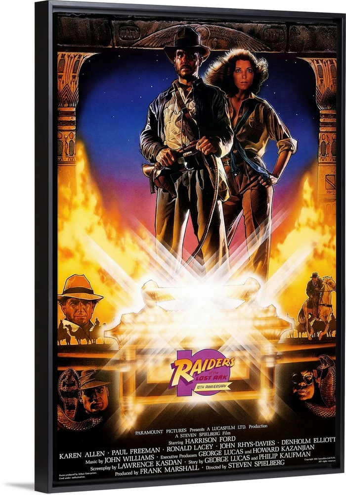<p>RAIDERS OF THE LOST ARK, US 10th anniversary re-issue poster, top, from left: Harrison Ford, Karen Allen, 1981.</p>