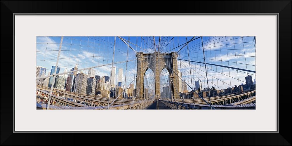 <p>Panoramic photograph taken from a landmark overpass in New York as it overlooks a busy skyline. The vertical and diagonal cables of the overpass are layered on top of the skyscrapers in the background.</p>