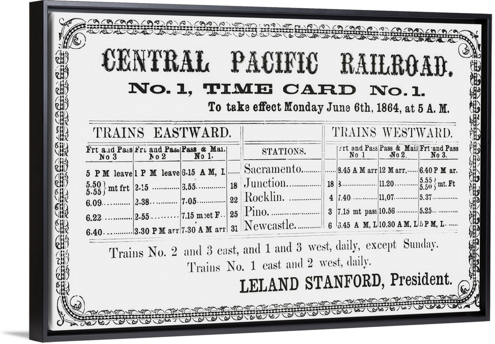 <p>First Timetable. Here is the first official timetable published by the pioneer Central Pacific, parent of the present Southern Pacific. It announced service over the railroad's first 31 miles of track between Sacramento and Newcastle. This was the first unit of the first transcontinental line to be placed in service.</p>