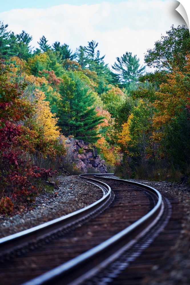 <p>Railroad tracks through an autumn coloured forest; Ontario, Canada</p>
