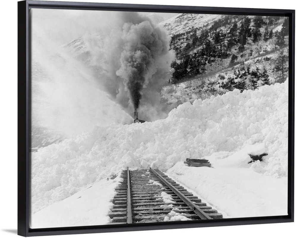 <p>Railway avalanche, Alaska, USA. Snow from an avalanche blocking a railway track, with a steam train seen in the background. Avalanches occur when blocks of snow slide down a mountainside. They are a hazard for mountain transport. This photograph was taken sometime between 1900 and 1930.</p>