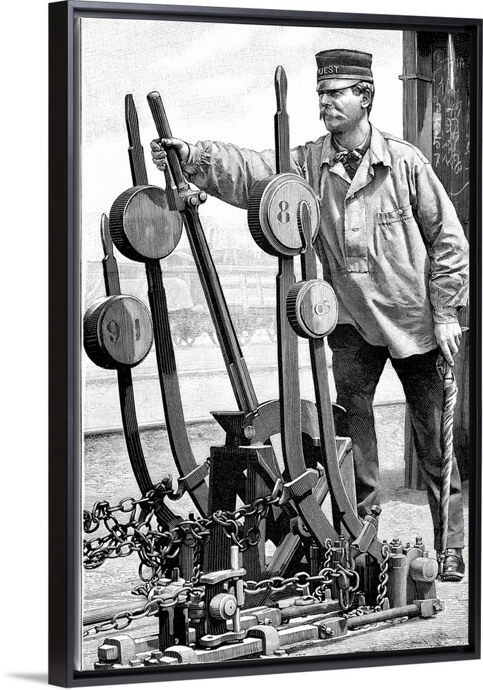 <p>Railway signalman operating train track switches and holding a furled signal flag. The first mechanised and centralised railway switching system dates from 1856, and were used on the railways in England. Signals were also being developed at the same time in France, with the signalman shown here with a cap from the Chemins de Fer de l'Ouest railway company. By the 1890s, major stations in England and France had switching points with as many as 50-70 levers. Artwork from the eighth volume (second period of 1891) of the French popular science weekly 'La Science Illustree'.</p>