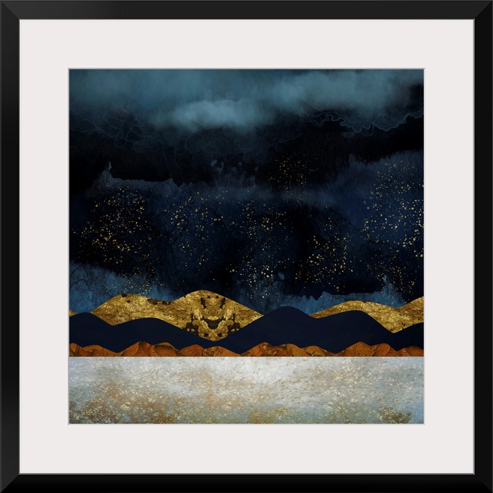 <p>Abstract landscape with rain, mountains, gold, indigo, brown and texture.</p>