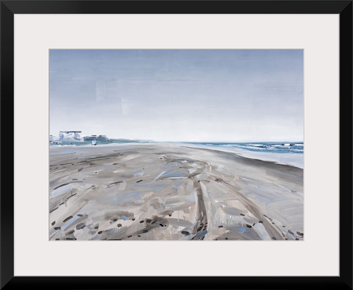 <p>Contemporary painting of a beach with tire tracks imprinted in the sand.</p>