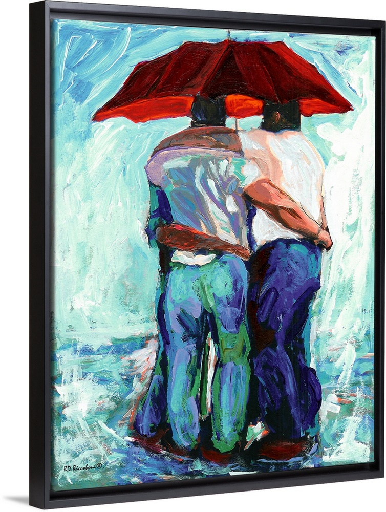 <p>Contemporary painting of three friends seeking shelter underneath a red umbrella.</p>