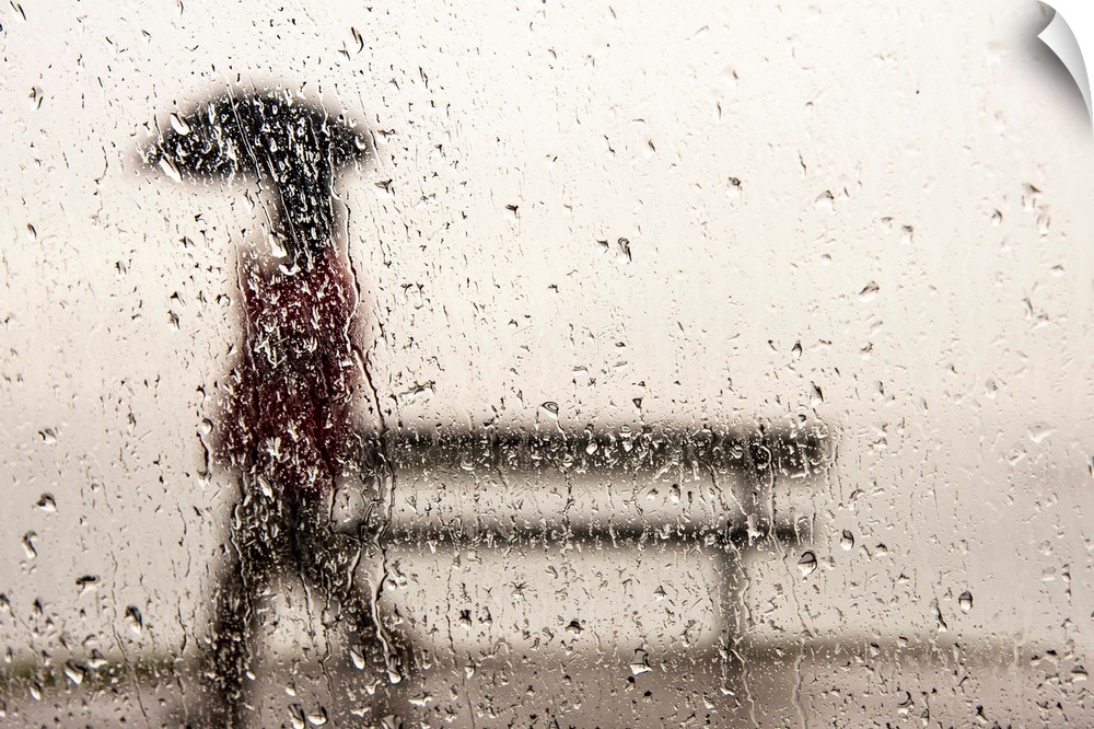 <p>A man walking with an umbrella against a rain streaked window.</p>