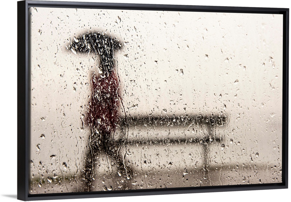 <p>A man walking with an umbrella against a rain streaked window.</p>