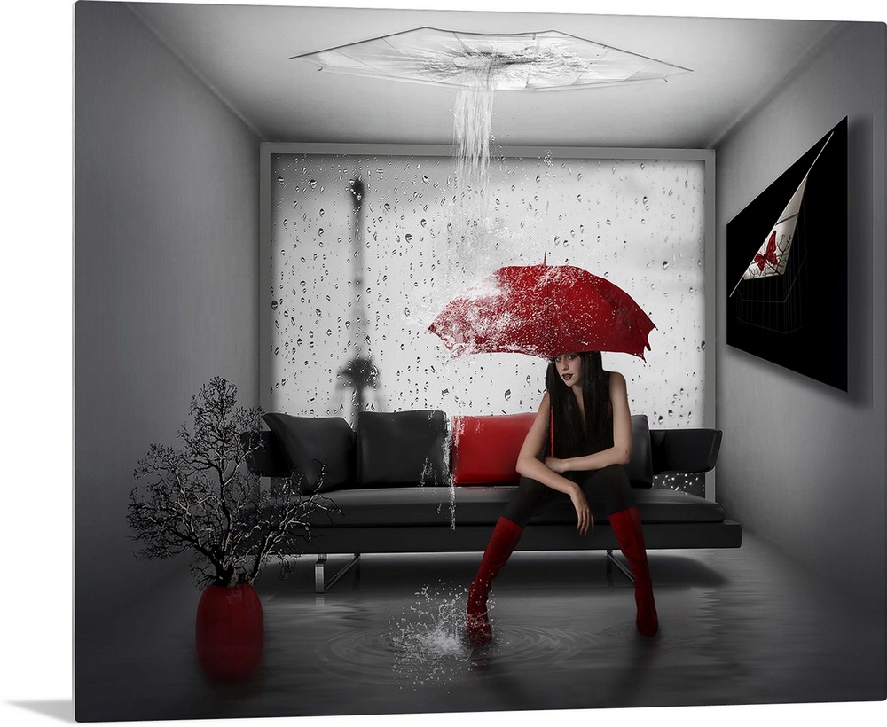 <p>Conceptual image of a woman with a red umbrella in a room filling up with water.</p>
