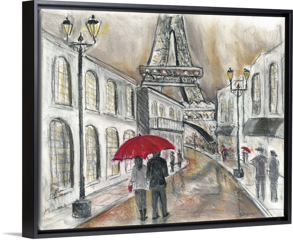 <p>Charcoal sketch of a Paris cityscape with the Eiffel Tower in the background and people walking in the rain with bright red umbrellas.</p>