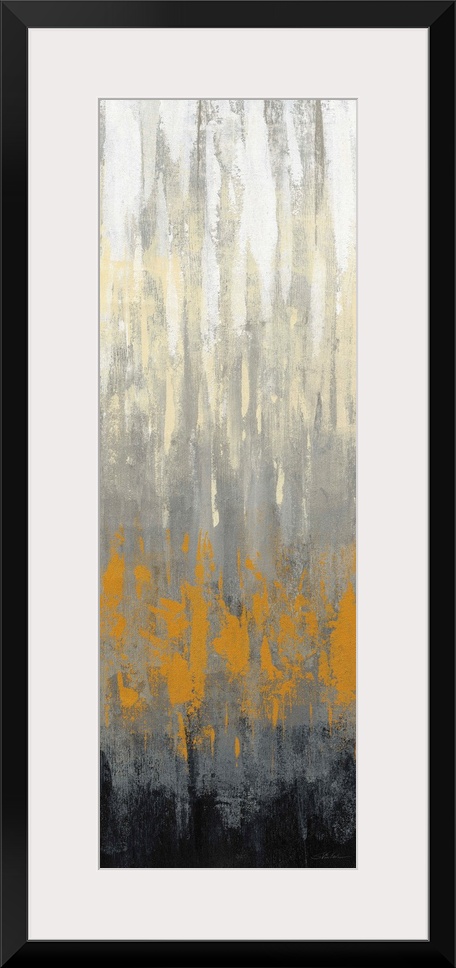 <p>A long, narrow vertical abstract of textured gradient tones of grey, orange and black.</p>