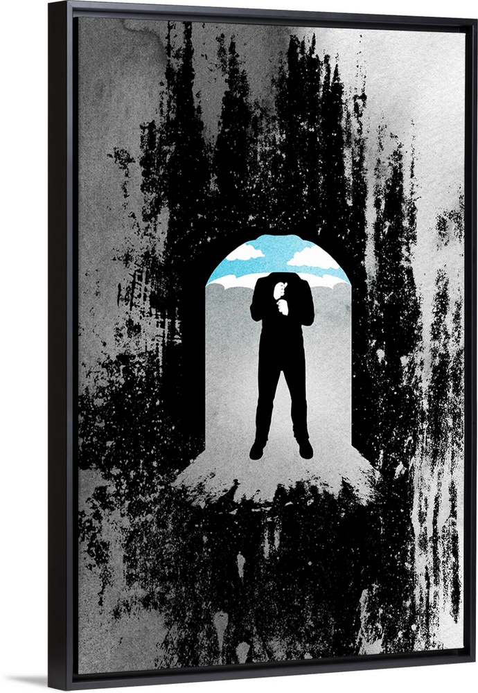 <p>A headless person is drawn through a grim doorway with a blue sky and clouds just behind him.</p>