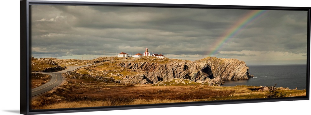 <p>A rainbow across the storm clouds and over the Atlantic ocean and coastline of Newfoundland; Newfoundland, Canada</p>