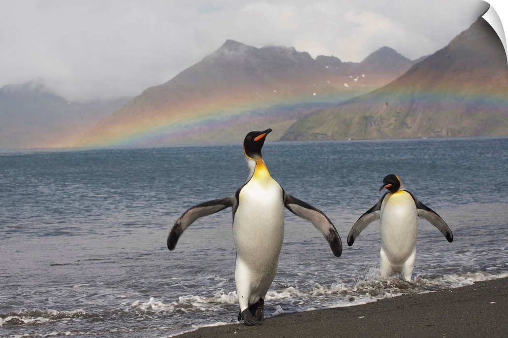 <p>Rainbow behind two King Penguins (Aptenodytes patagonicus) on the shoreline at a massive rookery at Saint Andrews Bay, South Georgia Island, Antarctica.</p>