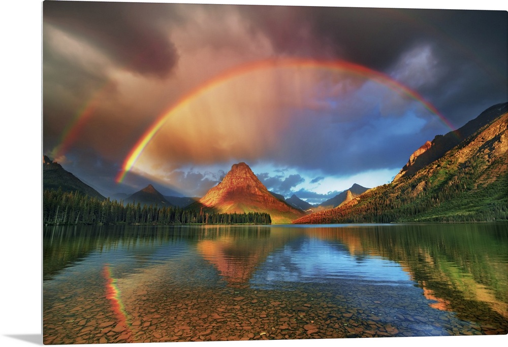 <p>Rainbow at Two Medicine Lake with Sinopah Mountain. USA, Montana, Glacier National Park, Two Medicine Lake. Rocky Mountains. Montana, North America, USA.</p>