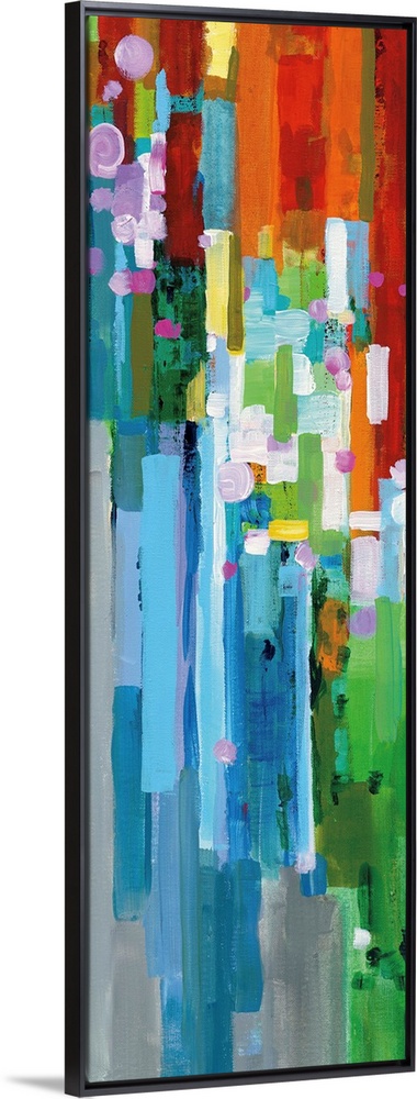 <p>Tall, rectangular abstract painting with rainbow vertical rectangles stacked together and falling from the dense top to the light bottom on a gray background.</p>