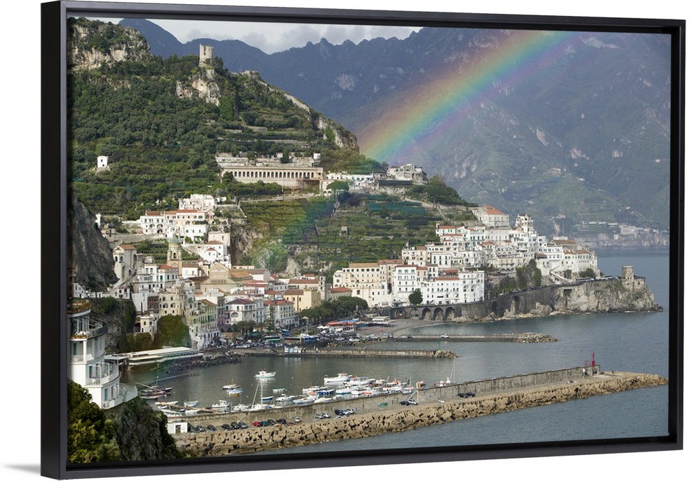 <p>This is a picture of a rainbow over a town off a coast in Italy. Large white buildings line the water that has piers with boats docked at them.</p>