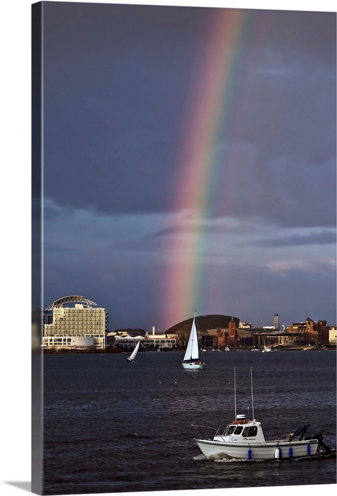 <p>Rainbow in dark sky and boat sailing in sea.</p>