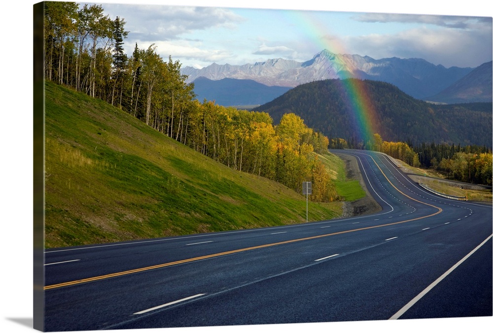<p>Rainbow over Glenn Highway in Matanuska Valley during Autumn in Southcentral Alaska</p>
