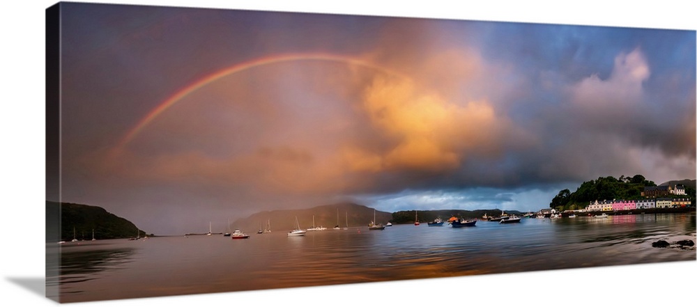 <p>Rainbow over harbor at sunset, portree, isle of skye, scotland.</p>