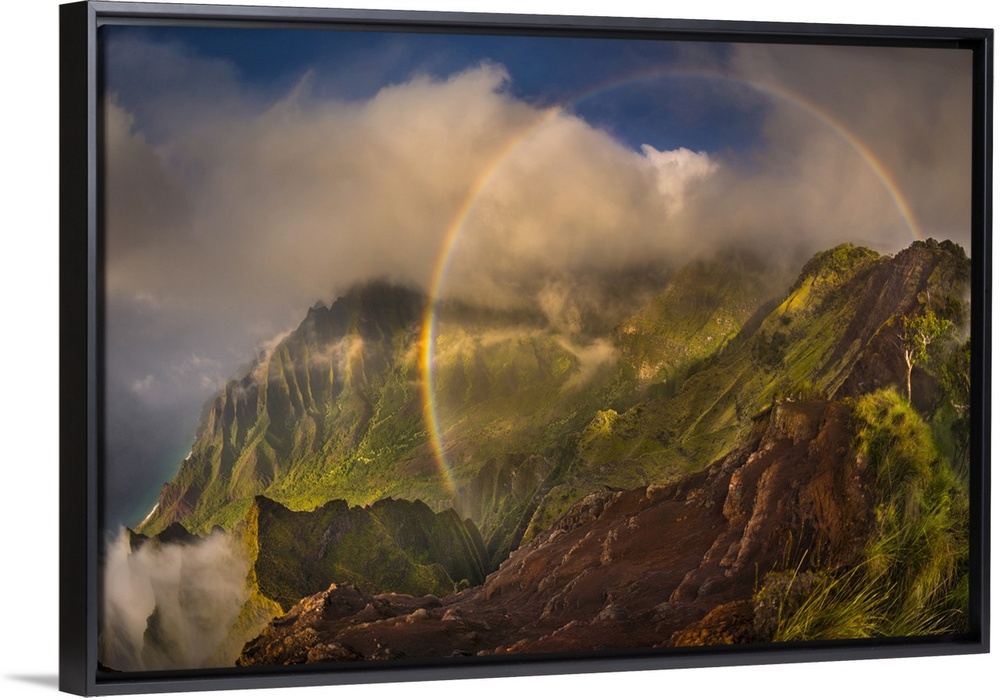<p>A 180 degree rainbow formed by the clouds over the Kalalau Valley on Kauai's west coast in the evening, Napali Coast State Wilderness Park, Kauai, Hawaii, United States of America, Pacific</p>