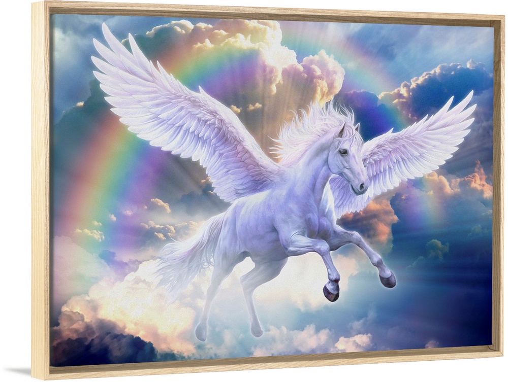 <p>Artwork of a white Pegasus flying through a rainbow in a sky of blue clouds.</p>