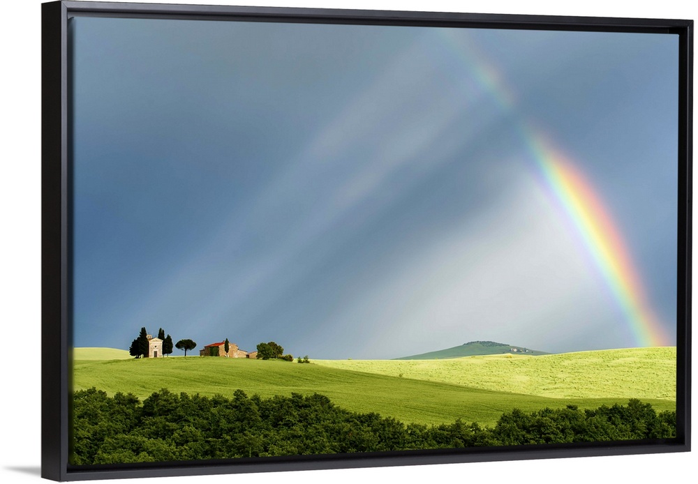 <p>A photograph of a Tuscan countryside bathed in the light streaming from a rainbow.</p>