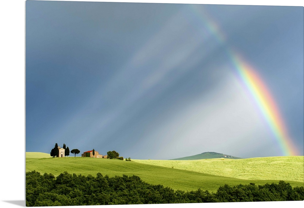 <p>A photograph of a Tuscan countryside bathed in the light streaming from a rainbow.</p>