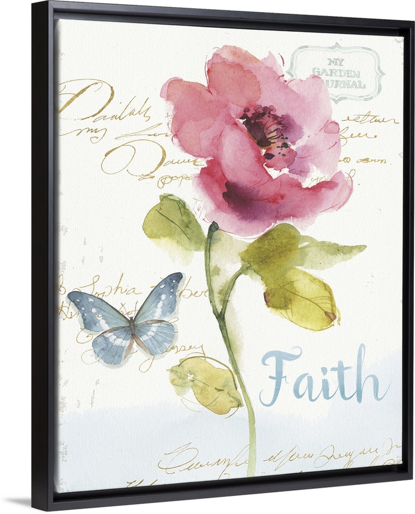 <p>Watercolor painting of a pink flower and a blue butterfly with the word "Faith" written in blue at the bottom and gold handwritten text in the background.</p>
