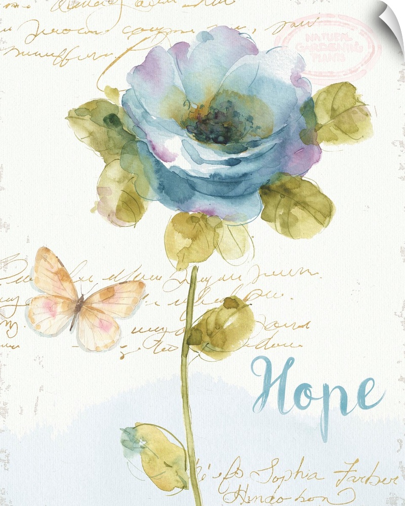 <p>Watercolor painting of a blue and purple toned flower and a butterfly with the word "Hope" written in blue on the bottom and gold handwritten text in the background.</p>