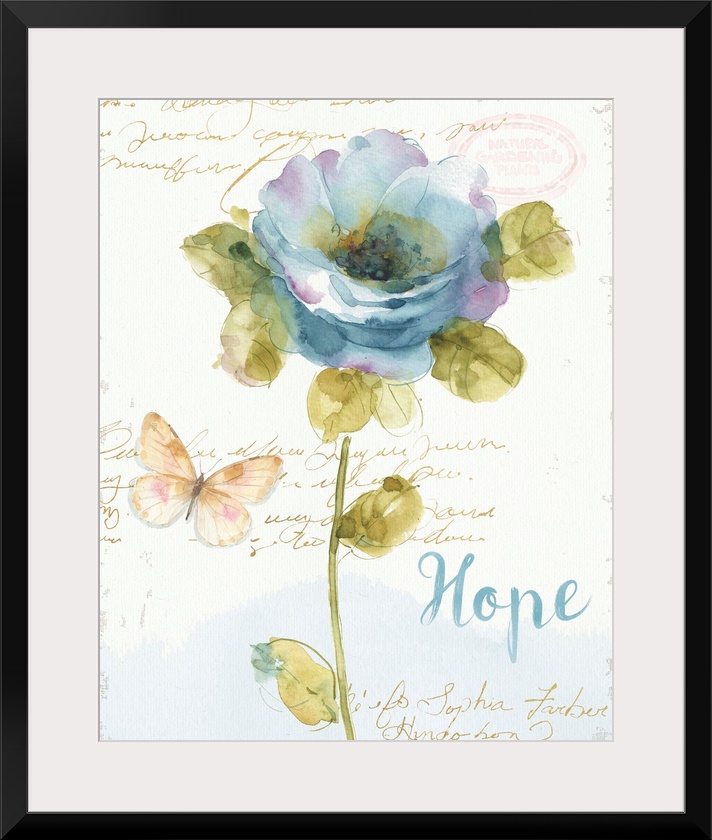 <p>Watercolor painting of a blue and purple toned flower and a butterfly with the word "Hope" written in blue on the bottom and gold handwritten text in the background.</p>