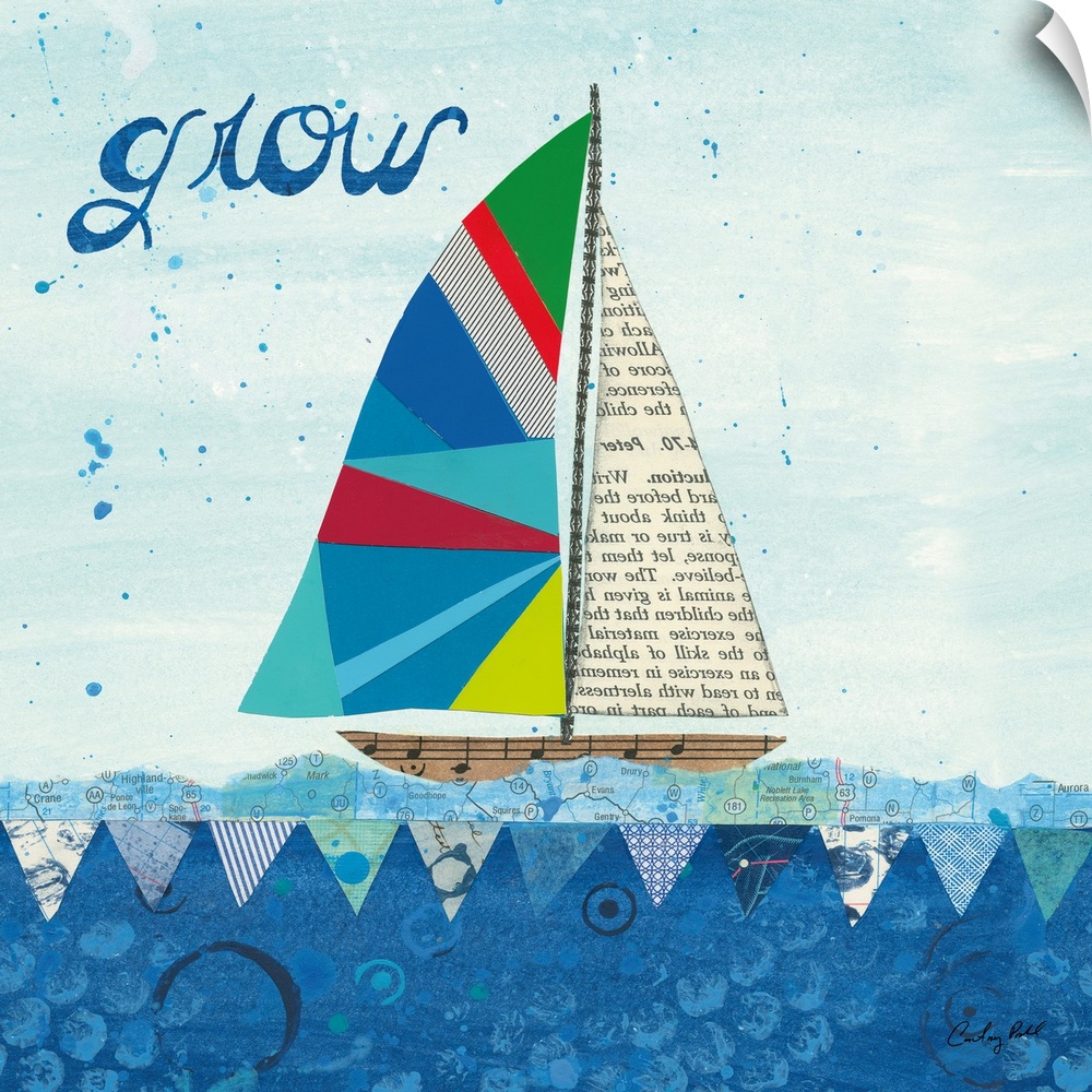 <p>Decorative collage artwork featuring a whimsical sailboat floating on the sea with the word, 'Grow' in the top left corner.</p>