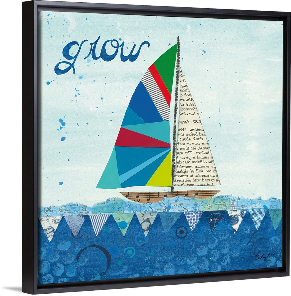 <p>Decorative collage artwork featuring a whimsical sailboat floating on the sea with the word, 'Grow' in the top left corner.</p>