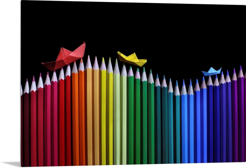 <p>Little origami boats sailing on waves of colored pencils.</p>