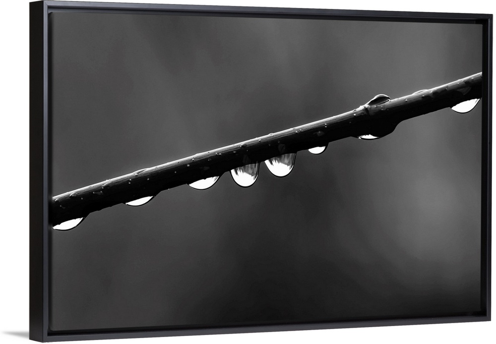 <p>Black and white macro photograph of rain droplets on a branch.</p>