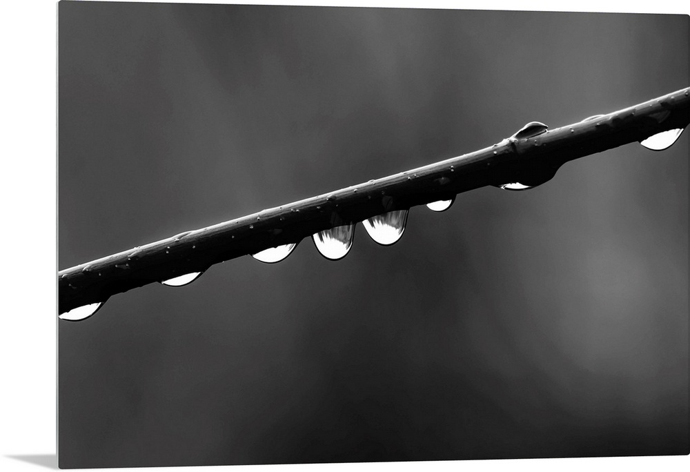 <p>Black and white macro photograph of rain droplets on a branch.</p>