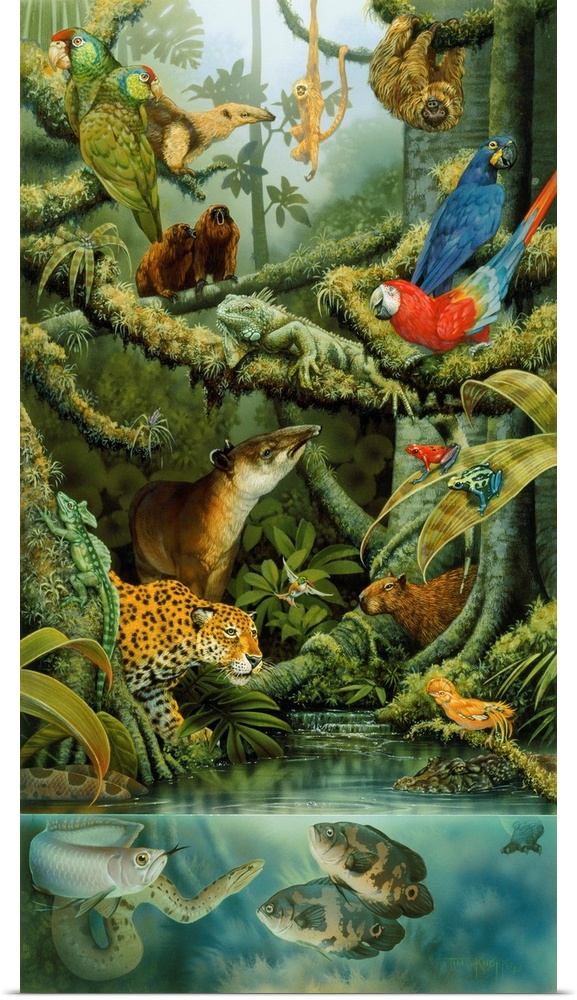 <p>Parrots, an anteater, leopard, sloths, frogs and other rainforest animals</p>