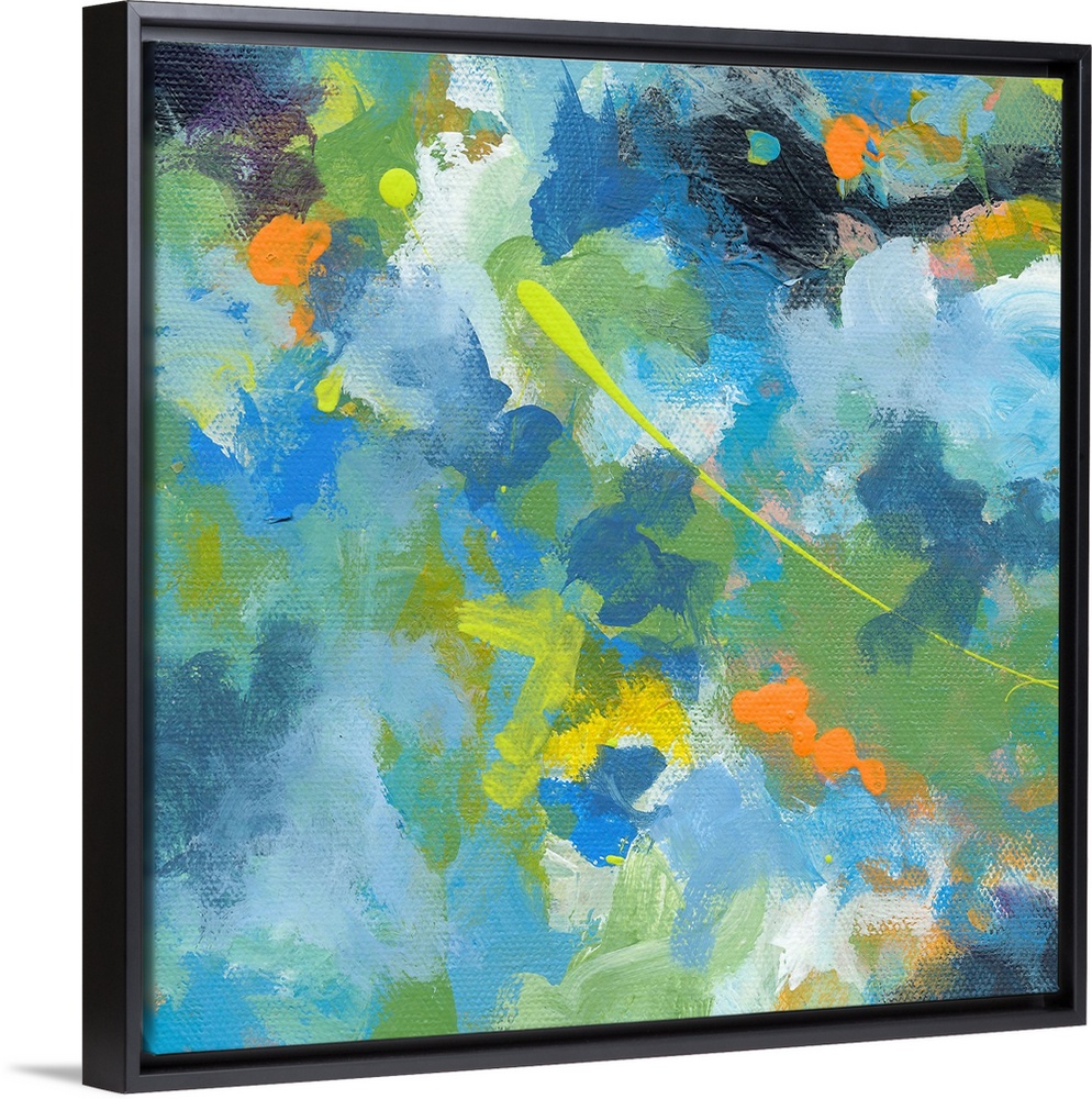 <p>A contemporary abstract painting that has mostly cool tones with pops of yellow and orange for brightness.</p>