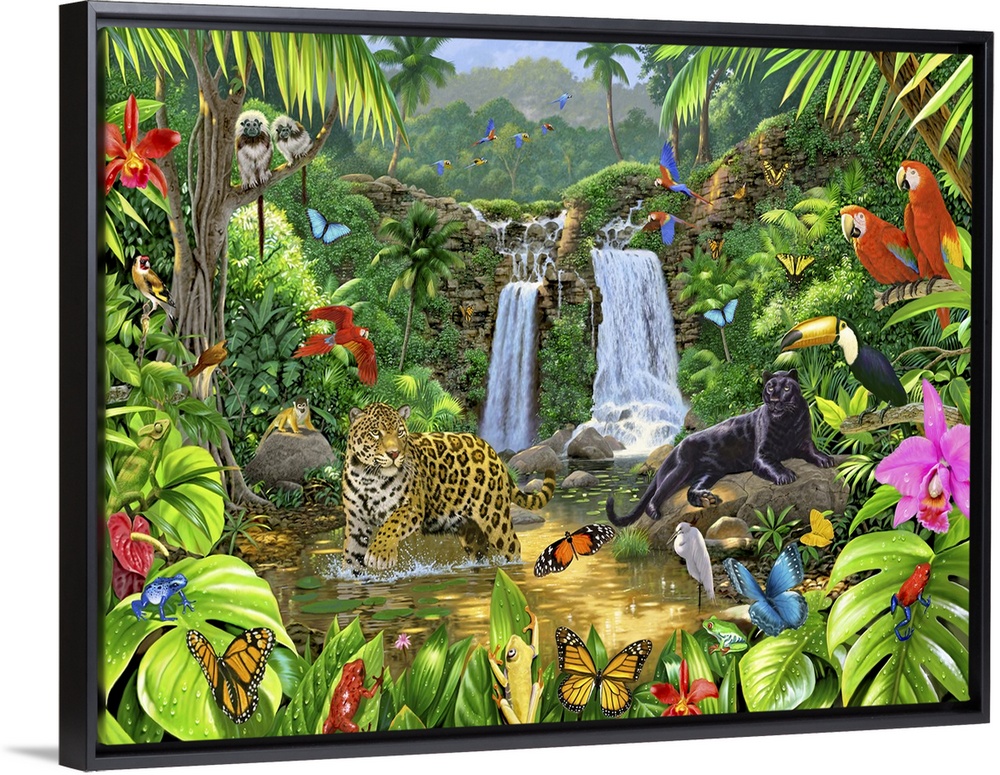 <p>Large painting of different animals in a rainforest with two waterfalls flowing in the background.</p>