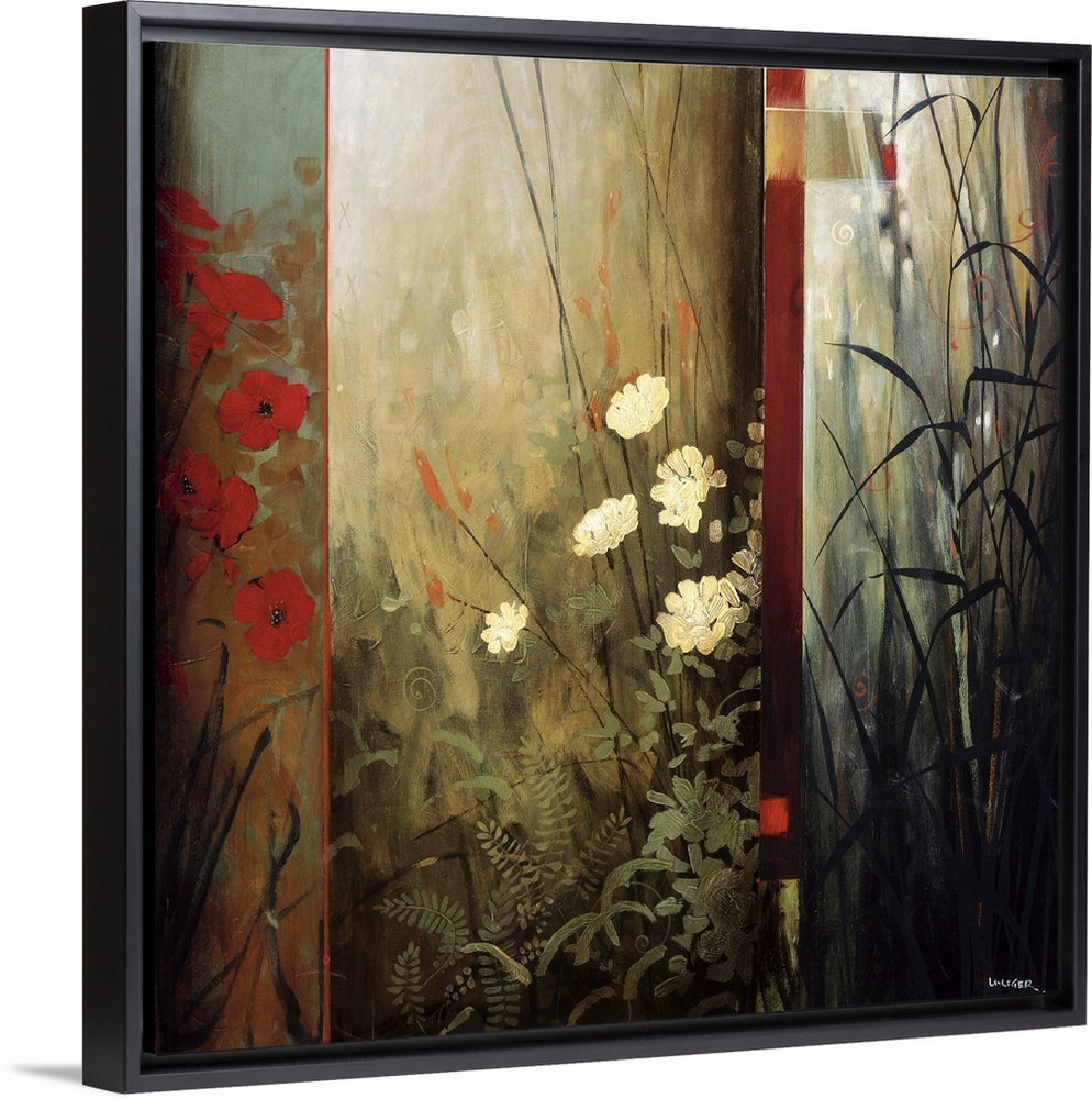 <p>A contemporary painting of red and white flowers separated in a paneled design.</p>