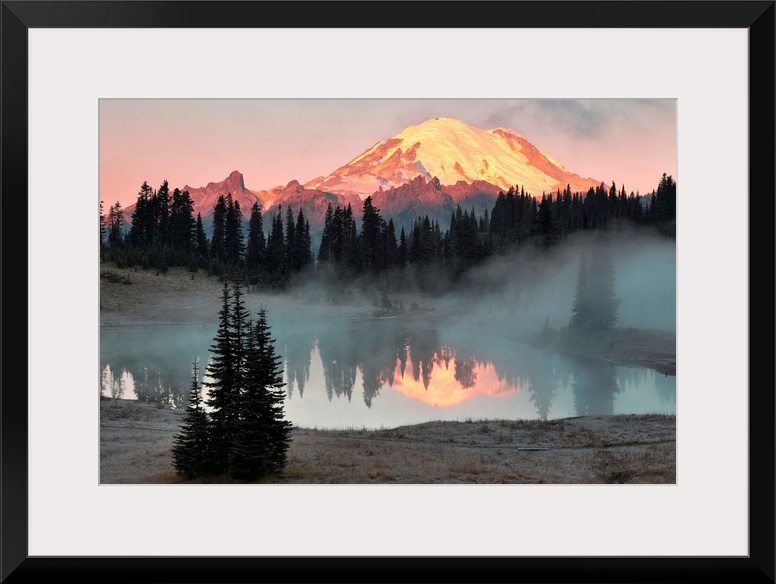<p>Fine art photo of sunlight hitting the snow peak of Mount Rainier, Washington.</p>