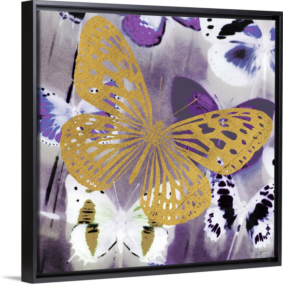 <p>Painting of a golden butterfly silhouette against a multi-toned purple butterfly background.</p>