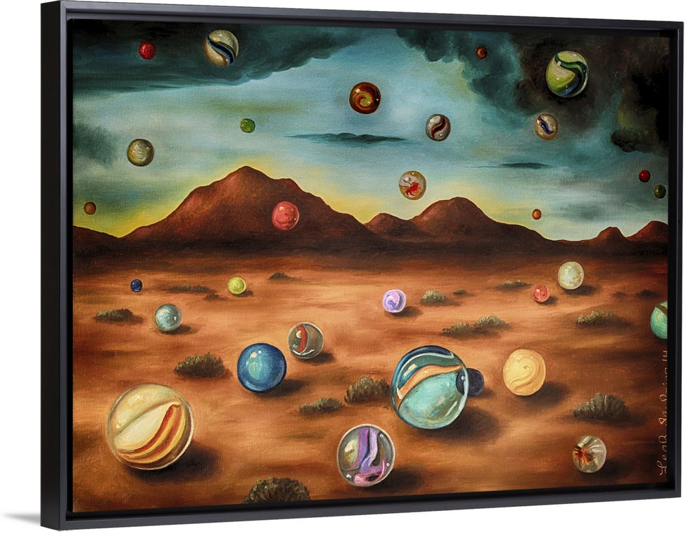 <p>Surrealist painting of a desert landscape with marbles raining down from the sky.</p>