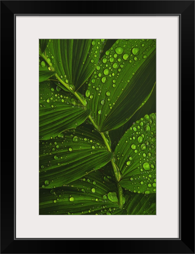 <p>Close-up photograph of bright green dew drop covered leaves.</p>