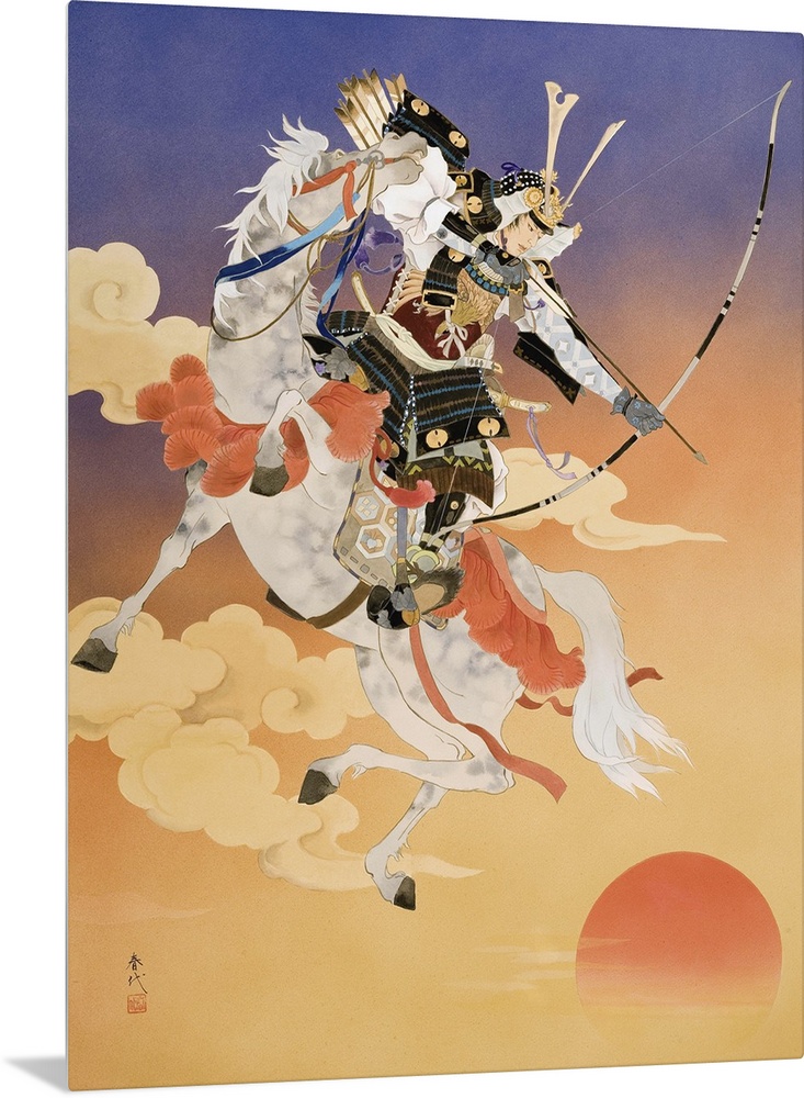 <p>Contemporary colorful Asian art of a samurai warrior on a white horse, with a bow and arrow.</p>
