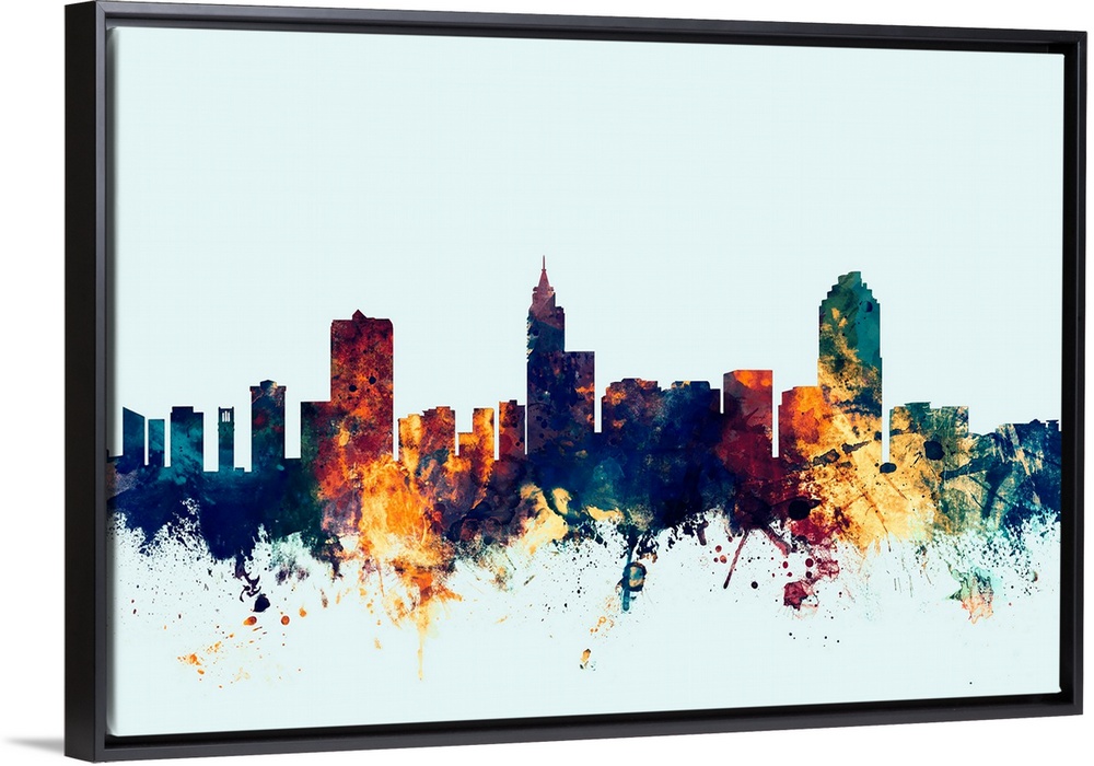 <p>Dark watercolor silhouette of the Raleigh city skyline against a light blue background.</p>
