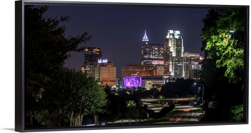 <p>Skyscrapers in Raleigh illuminated at night, seen from McDowell Street, North Carolina.</p>