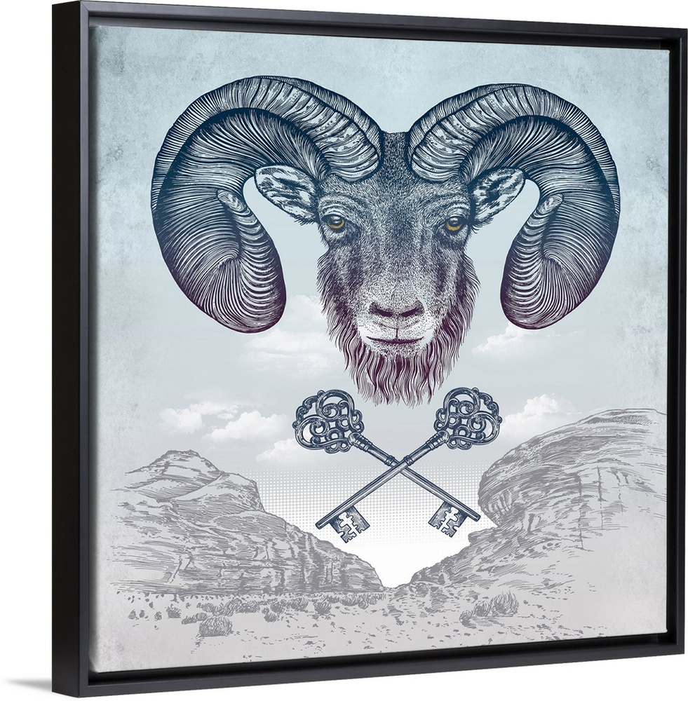 <p>A digital illustration of a ram in the sky above red rock mountains and a pair of keys.</p>