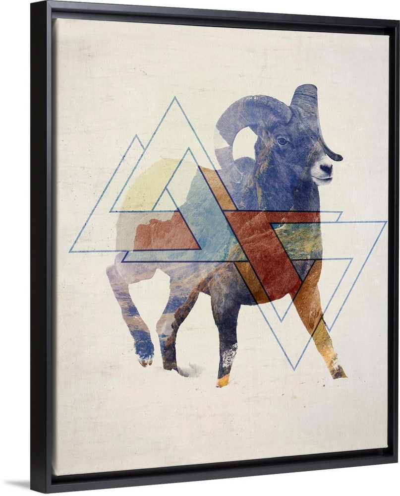 <p>Double exposure artwork of a bighorn sheep ram and mountains with triangular shapes.</p>