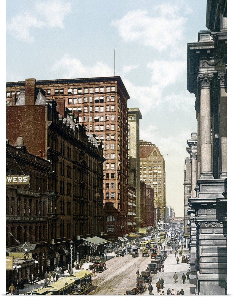 <p>Vintage photo on canvas of a street in Chicago with people and antique cars going up and down the street.</p>