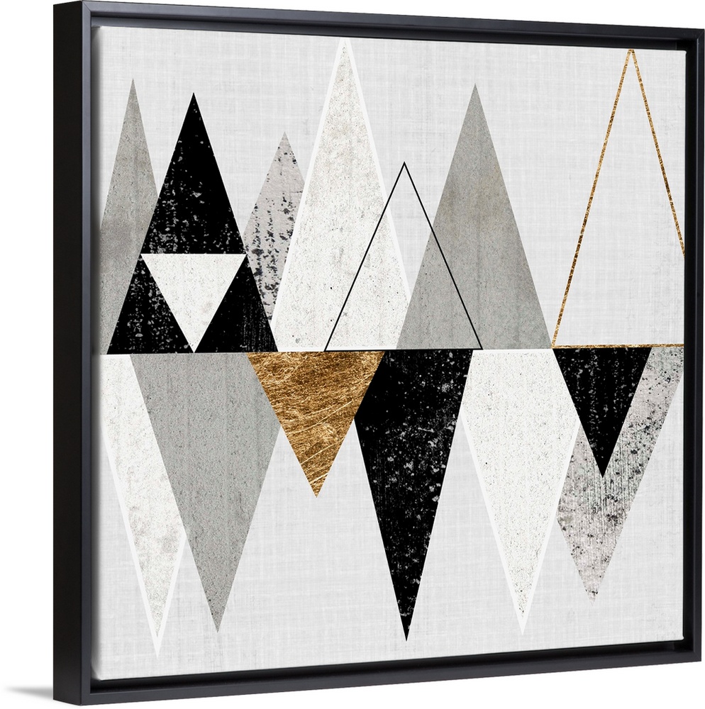 <p>Abstract art of two rows of triangles in black, grey, and gold.</p>